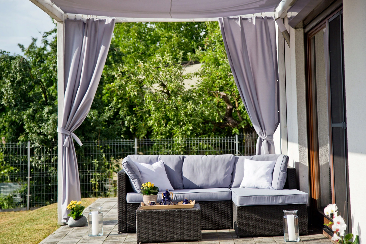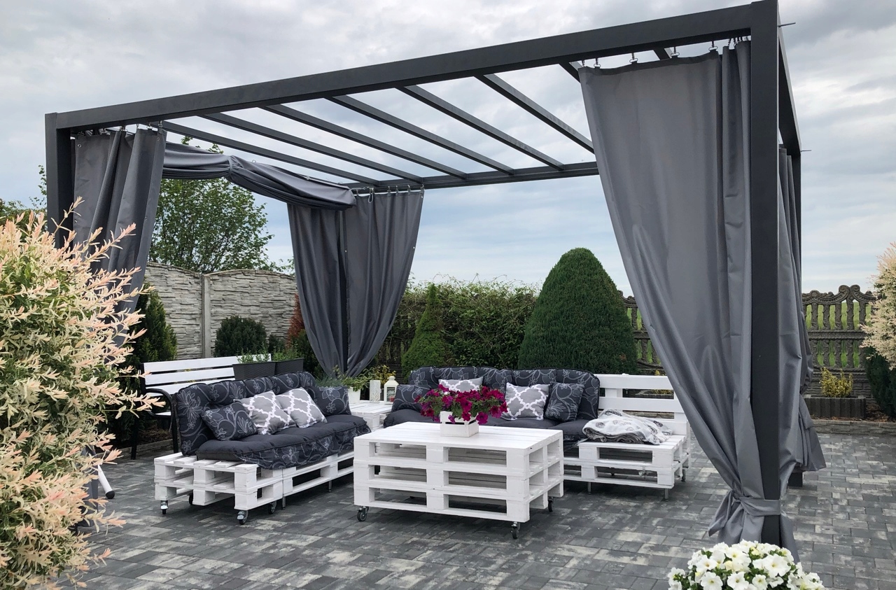 Nasze zasłony wykonane są ze splotu powstrzymującego krople wody przed wsiąkaniem - woda spływa po nich, dzięki czemu zasłona doskonale chroni przed deszczem, pozwalając cieszyć się świeżym powietrzem również w trakcie niepogody.