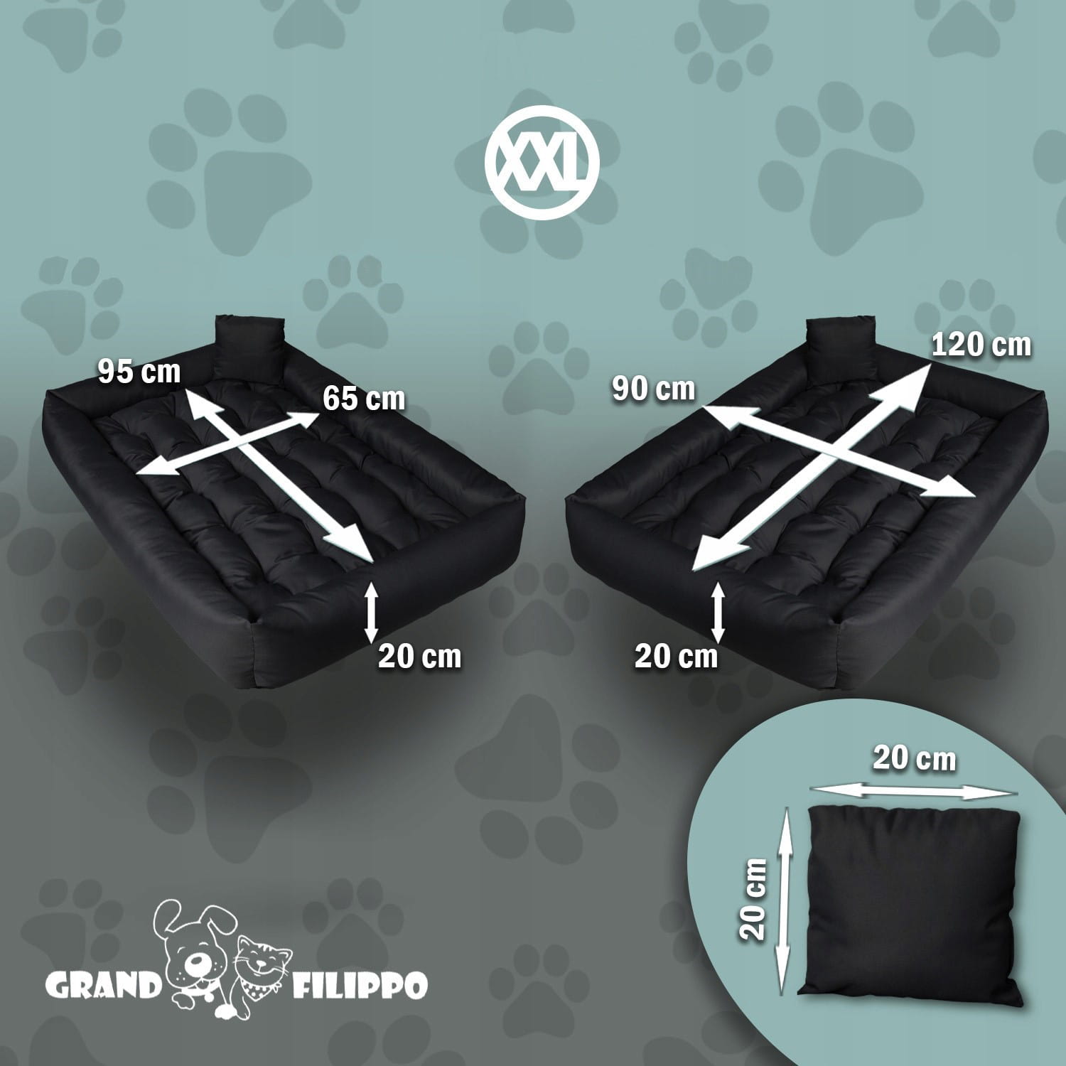 - Rozmiar: 120cm x 90cm (całkowity gabaryt legowiska),a rozmiar wewnętrzny to 95cm x 65cm