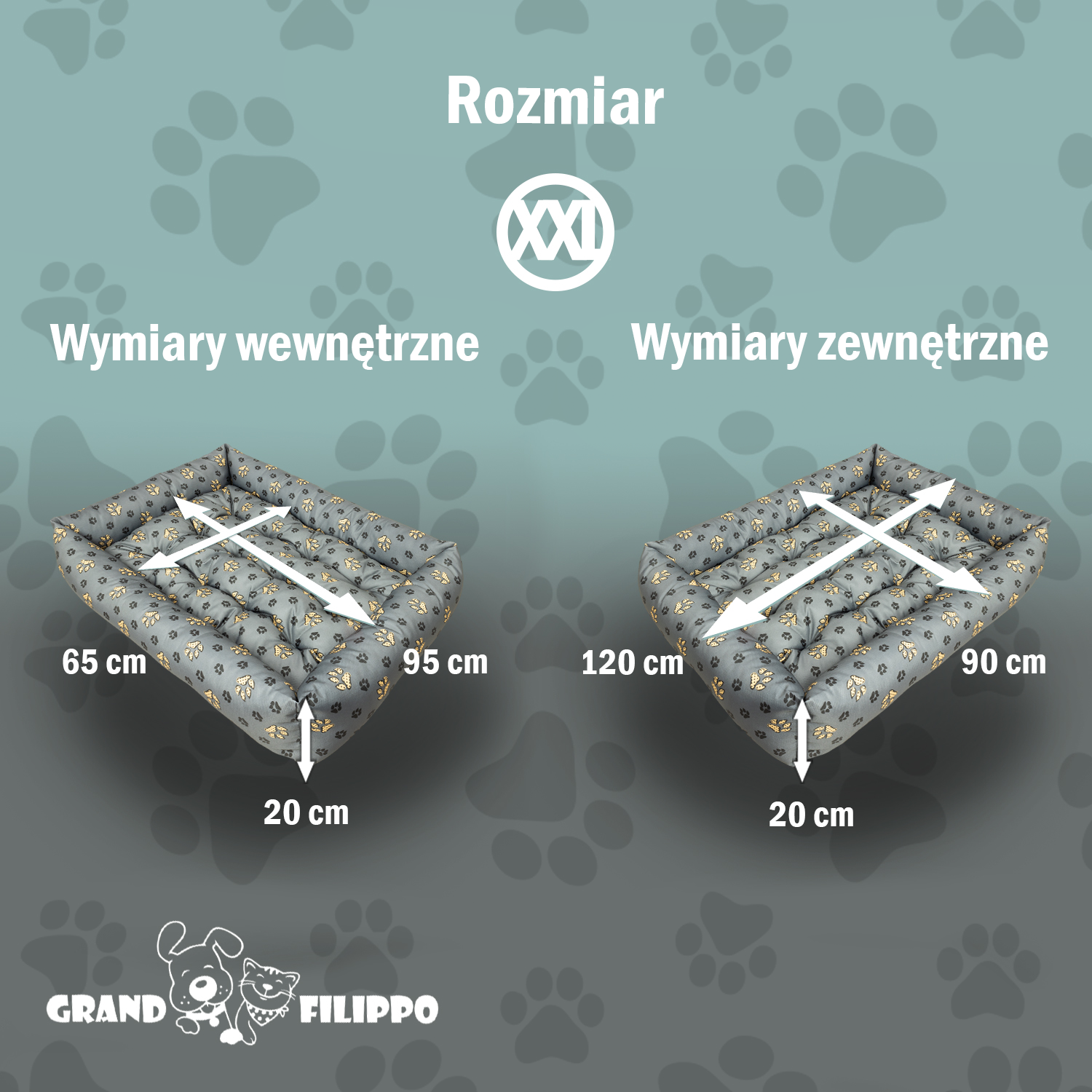 - Rozmiar: 120cm x 90cm (całkowity gabaryt legowiska),a rozmiar wewnętrzny to 95cm x 65cm