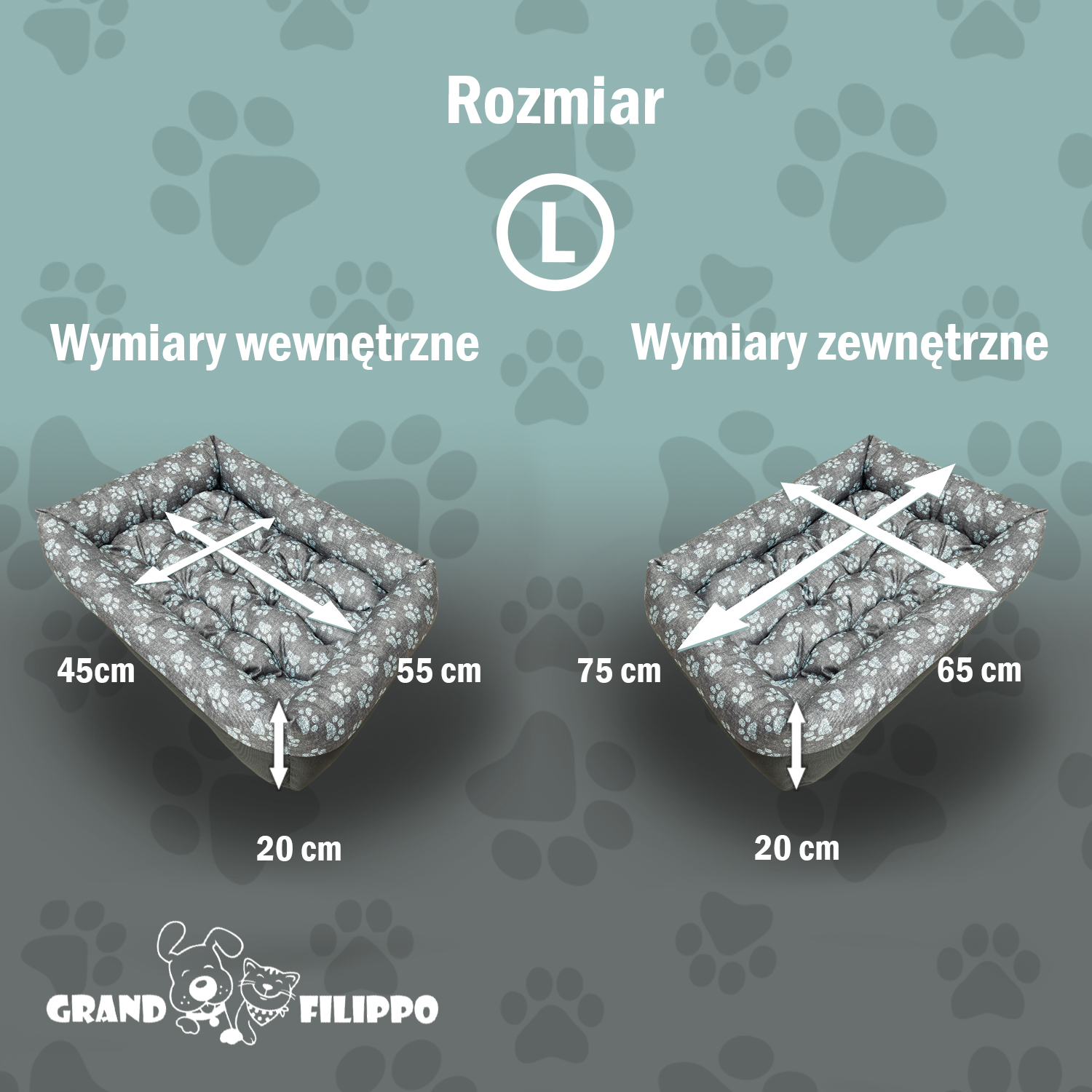 - Rozmiar: 75cm x 65cm (całkowity gabaryt legowiska),a rozmiar wewnętrzny to 55cm x 45cm