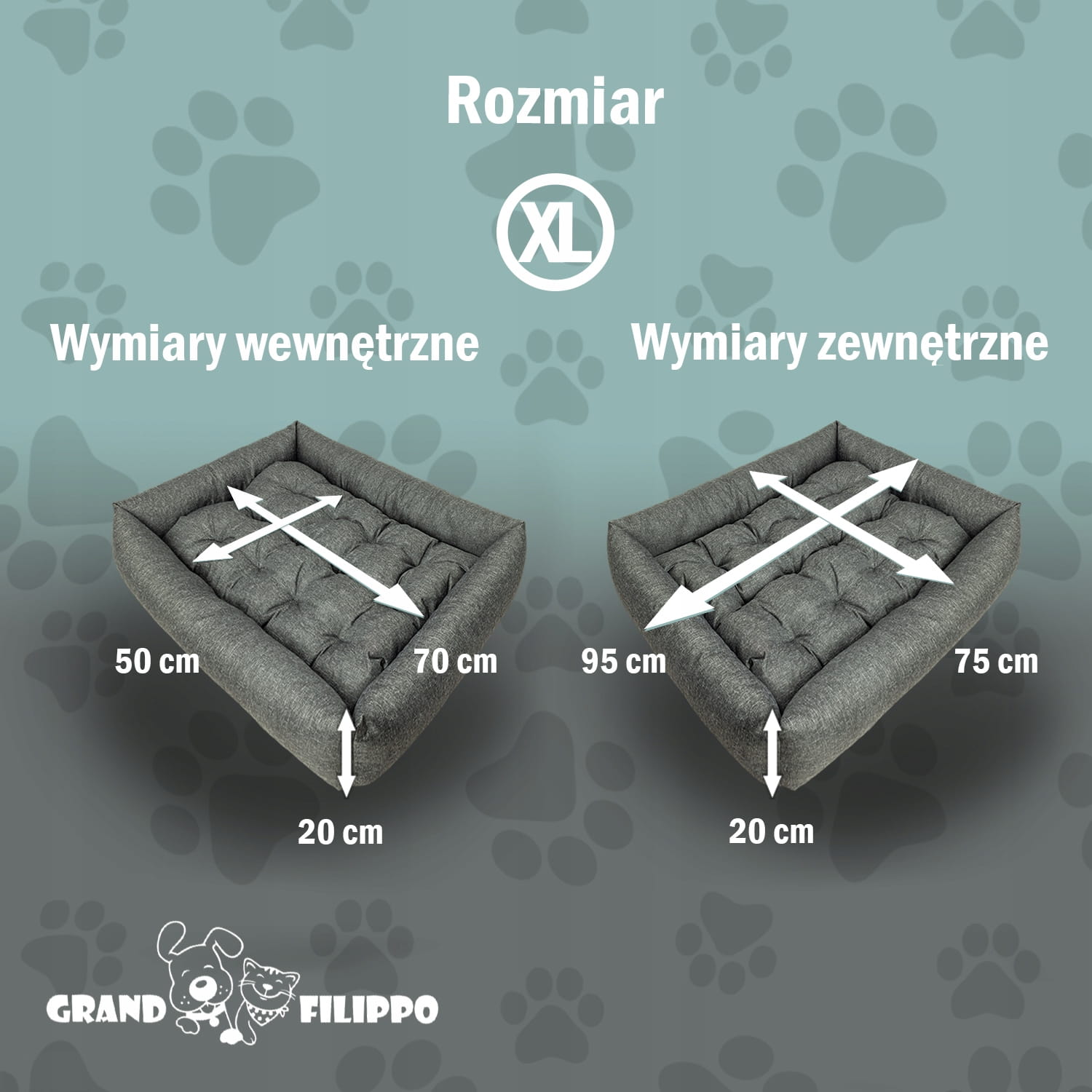 - Rozmiar: 95cm x 75cm (całkowity gabaryt legowiska), a rozmiar wewnętrzny to 70cm x 50cm