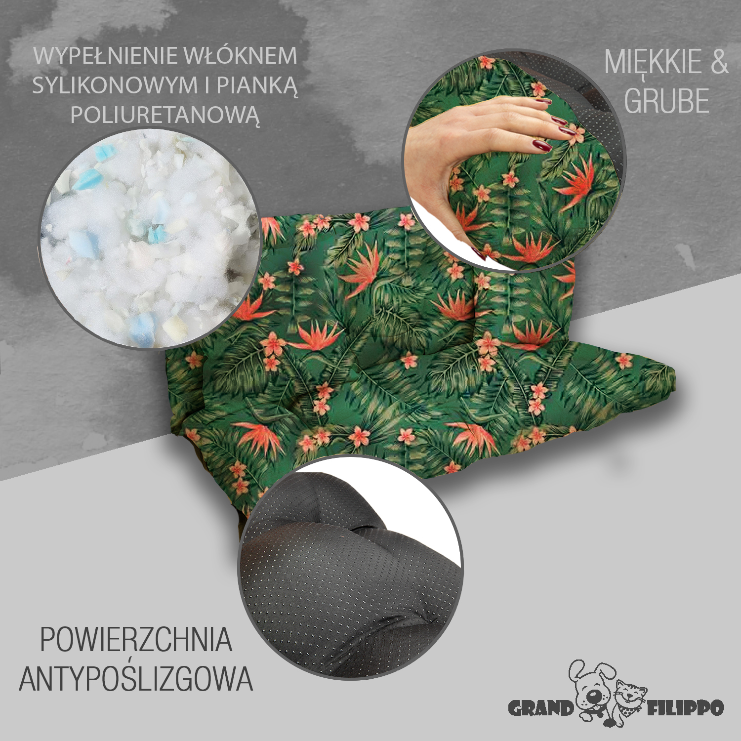 W naszych poduszkach na spodzie stosujemy Anti-Slip który posiada gumowe kulki zapobiegające przemieszczaniu się nawet na bardzo śliskich powierzchniach. Ponadto jest to materiał bardziej wytrzymały od zwykle stosowanego Wigofilu.