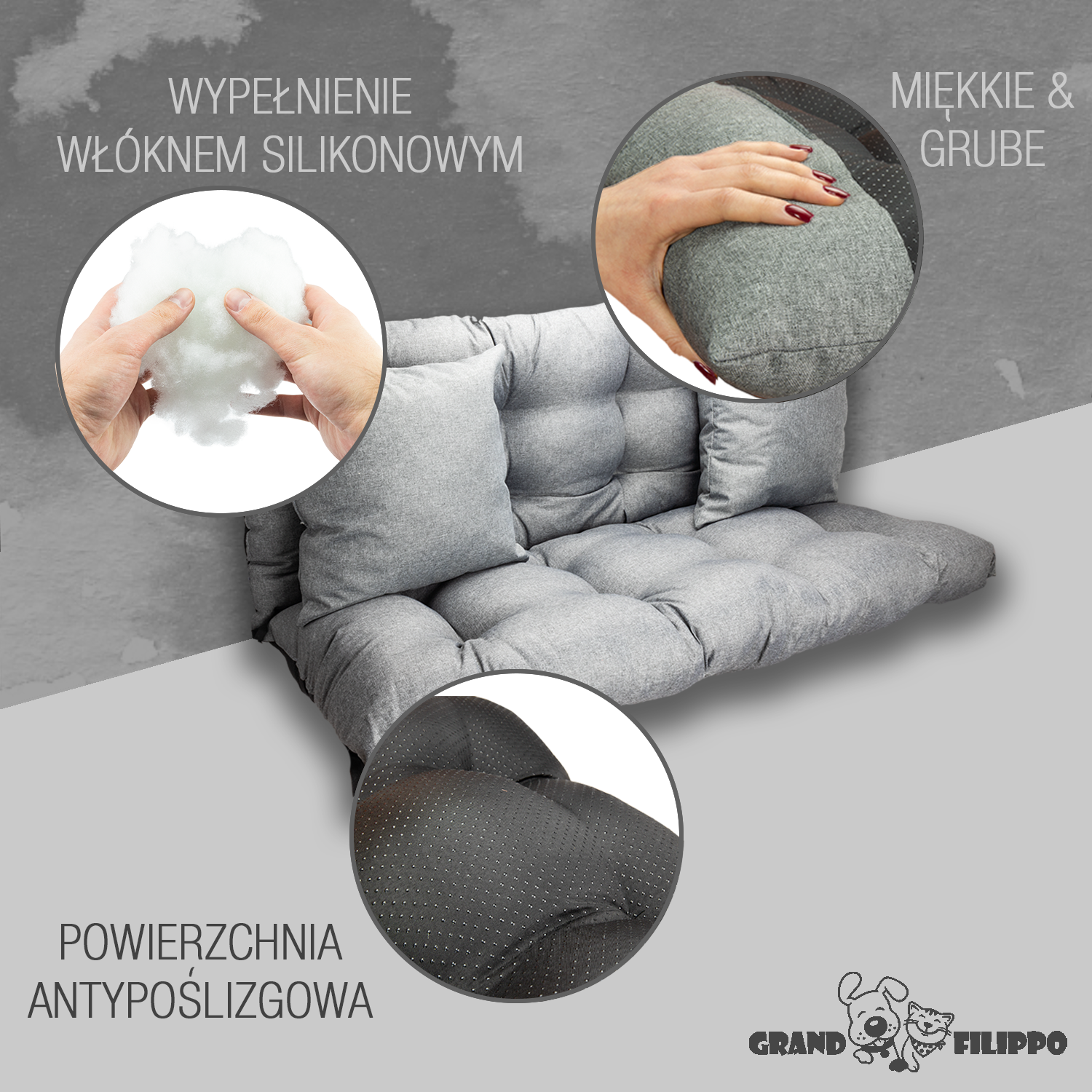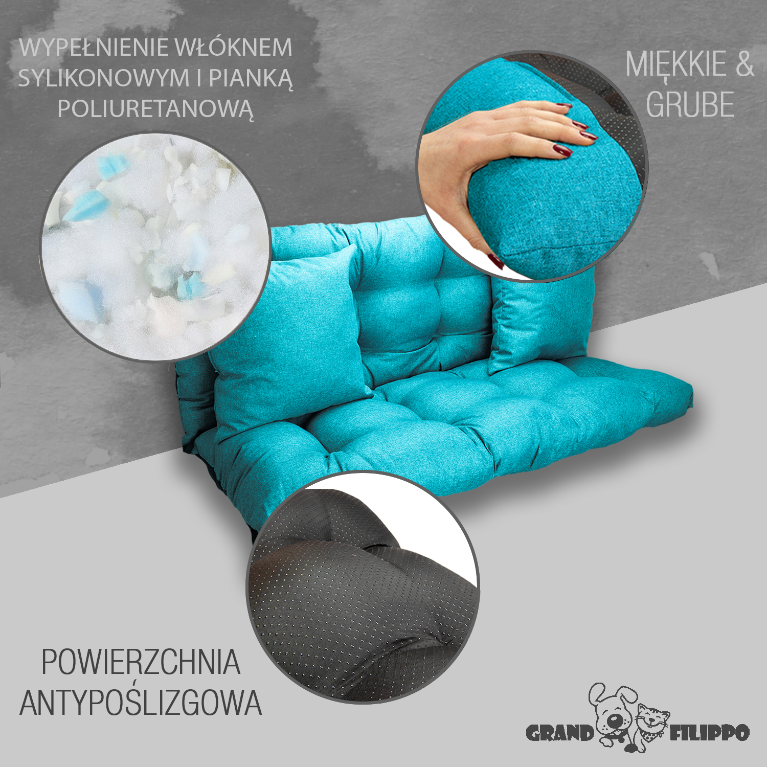 W naszych poduszkach na spodzie stosujemy Anti-Slip który posiada gumowe kulki zapobiegające przemieszczaniu się nawet na bardzo śliskich powierzchniach. Ponadto jest to materiał bardziej wytrzymały od zwykle stosowanego Wigofilu.