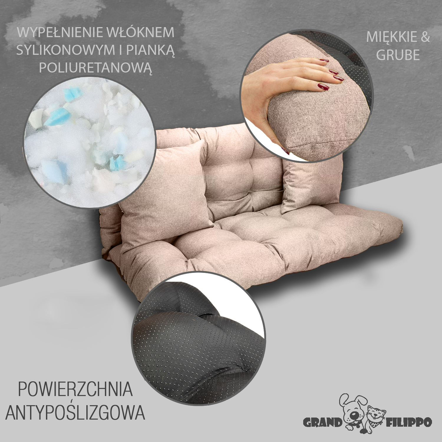 W naszych poduszkach na spodzie stosujemy Anti-Slip który posiada gumowe kulki zapobiegające przemieszczaniu się nawet na bardzo śliskich powierzchniach. Ponadto jest to materiał bardziej wytrzymały od zwykle stosowanego Wigofilu.