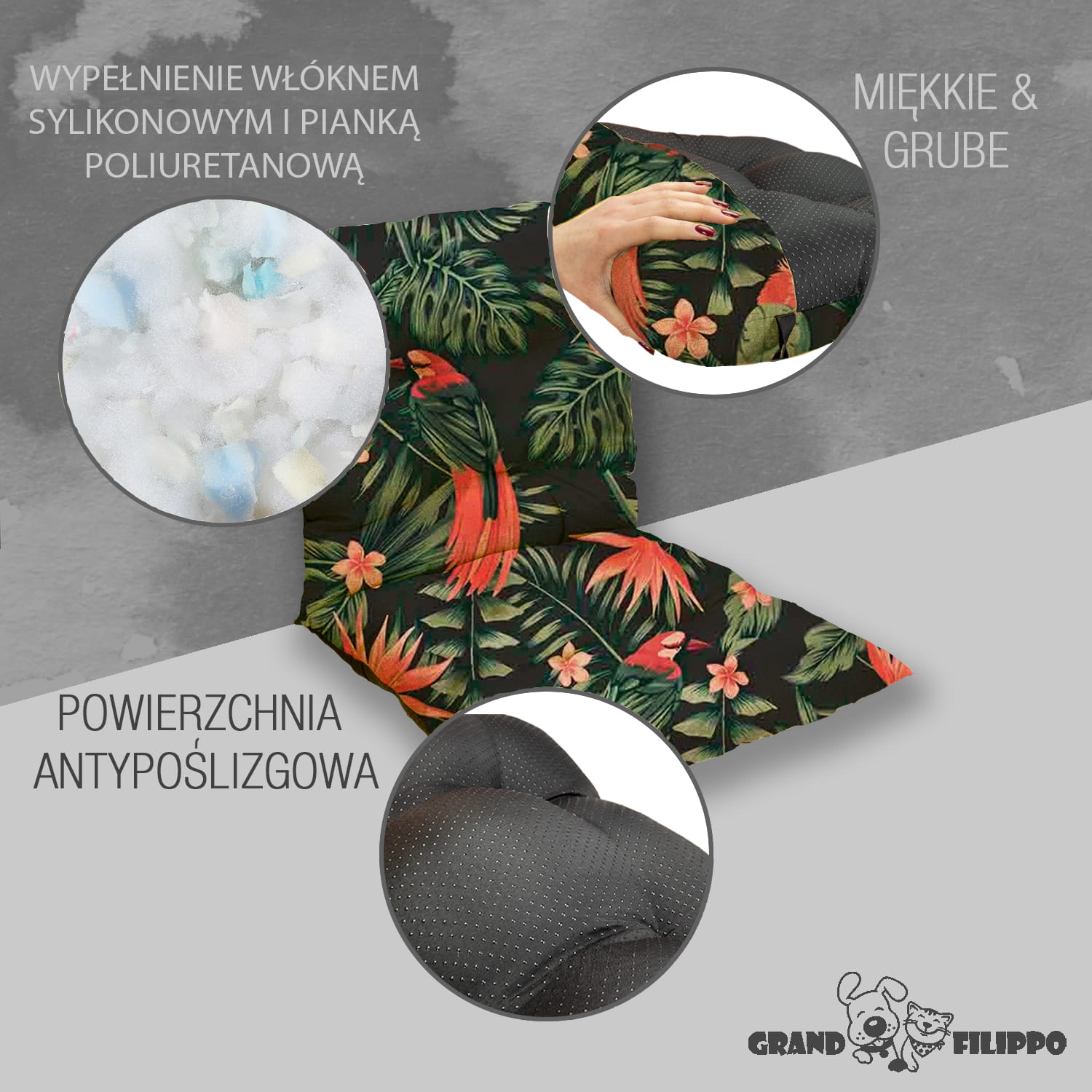 W naszych poduszkach na spodzie stosujemy Anti-Slip który posiada gumowe kulki zapobiegające przemieszczaniu się nawet na bardzo śliskich powierzchniach. Ponadto jest to materiał bardziej wytrzymały od zwykle stosowanego Wigofilu.