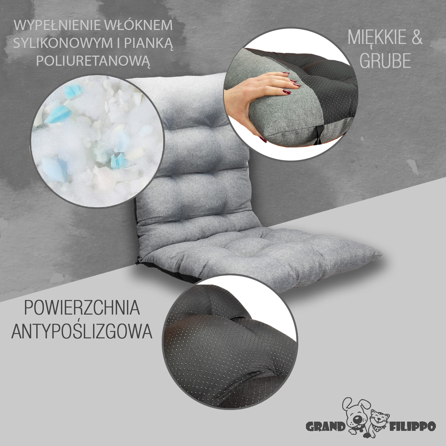 W naszych poduszkach na spodzie stosujemy Anti-Slip który posiada gumowe kulki zapobiegające przemieszczaniu się nawet na bardzo śliskich powierzchniach. Ponadto jest to materiał bardziej wytrzymały od zwykle stosowanego Wigofilu.