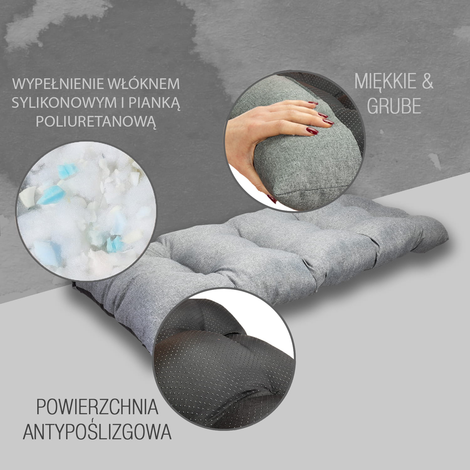 W naszych poduszkach na spodzie stosujemy Anti-Slip który posiada gumowe kulki zapobiegające przemieszczaniu się nawet na bardzo śliskich powierzchniach. Ponadto jest to materiał bardziej wytrzymały od zwykle stosowanego Wigofilu.