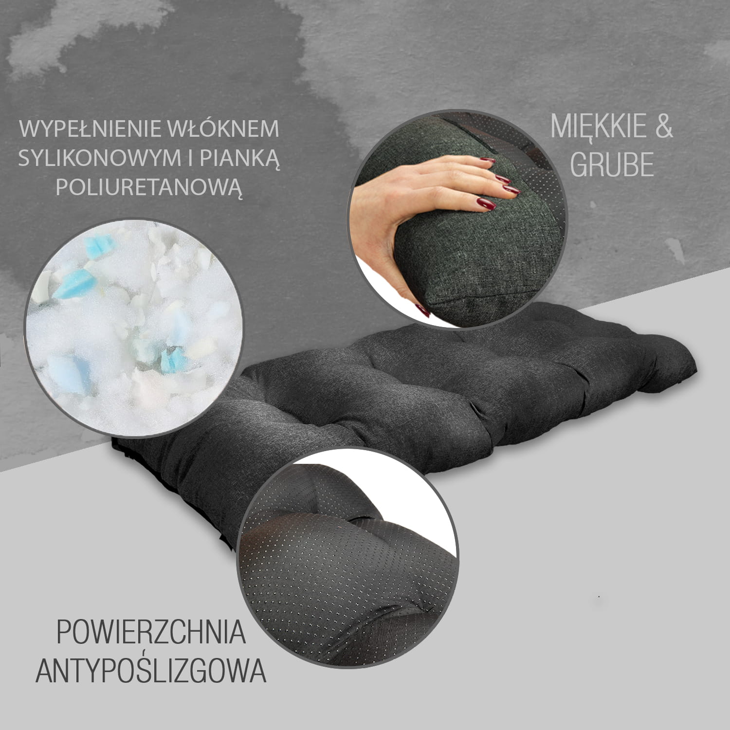 W naszych poduszkach na spodzie stosujemy Anti-Slip który posiada gumowe kulki zapobiegające przemieszczaniu się nawet na bardzo śliskich powierzchniach. Ponadto jest to materiał bardziej wytrzymały od zwykle stosowanego Wigofilu.